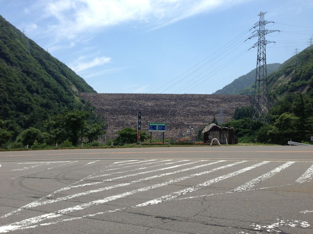 御母衣湖をたたえるダム、御母衣ダムはロックフィルダムなので堤体が岩でゴツゴツしています。