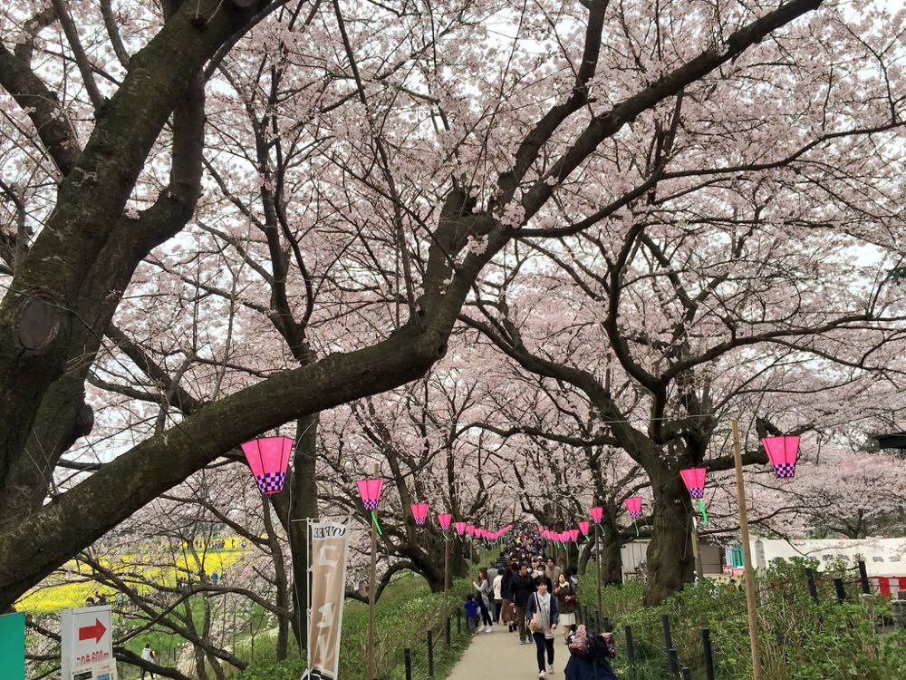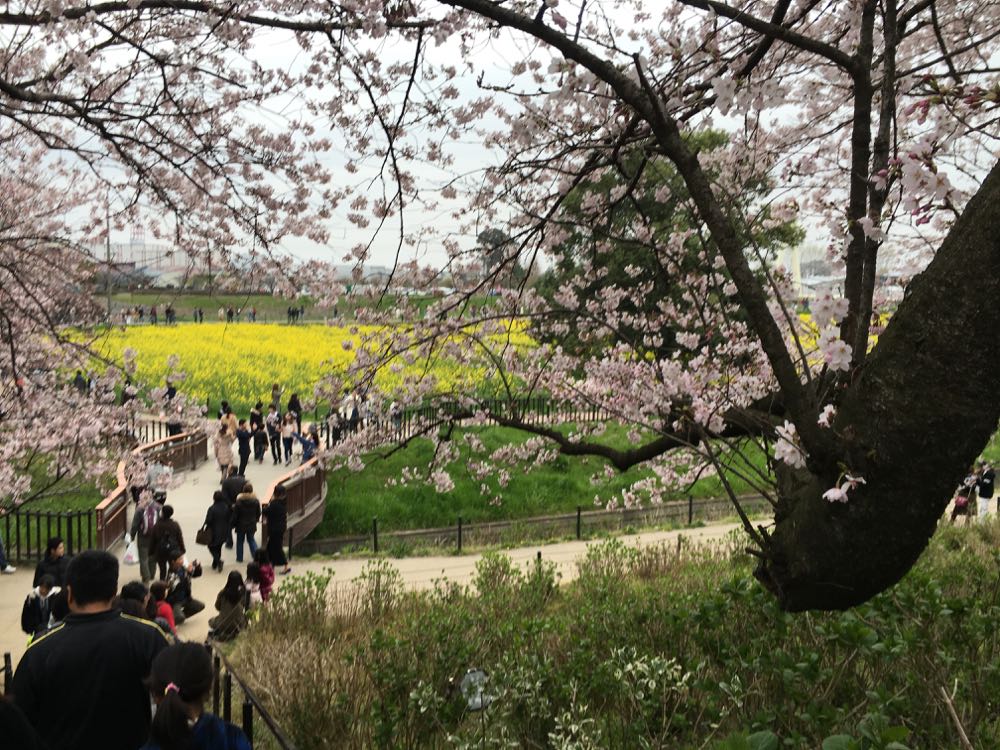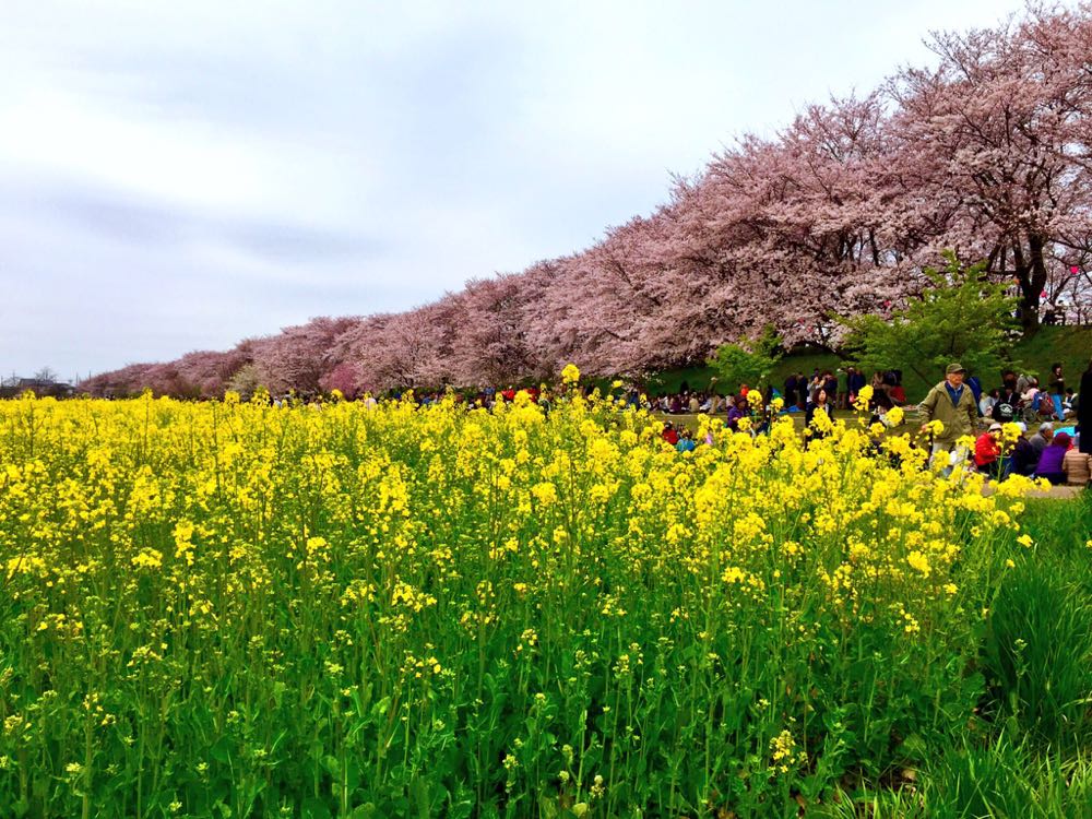 堤防に沿って桜並木と菜の花畑が並んでいて、