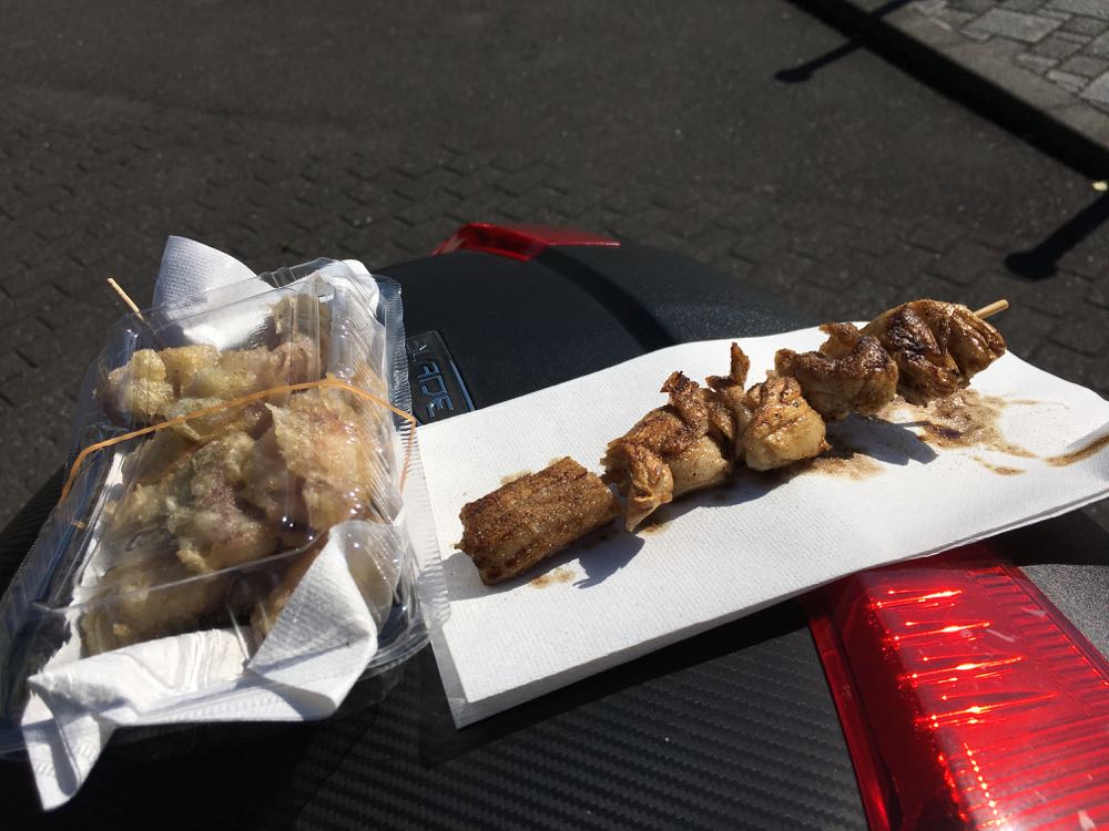 マンボウ串と地タコ天をいただきます。朝飯ガッツリで腹にたまりますw