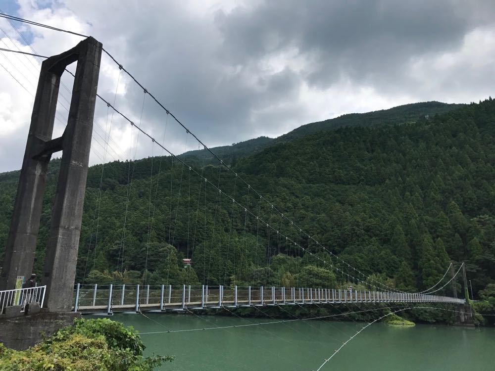 ダムの下流にかかる赤いラインは竜山橋。こちらも人道吊橋。