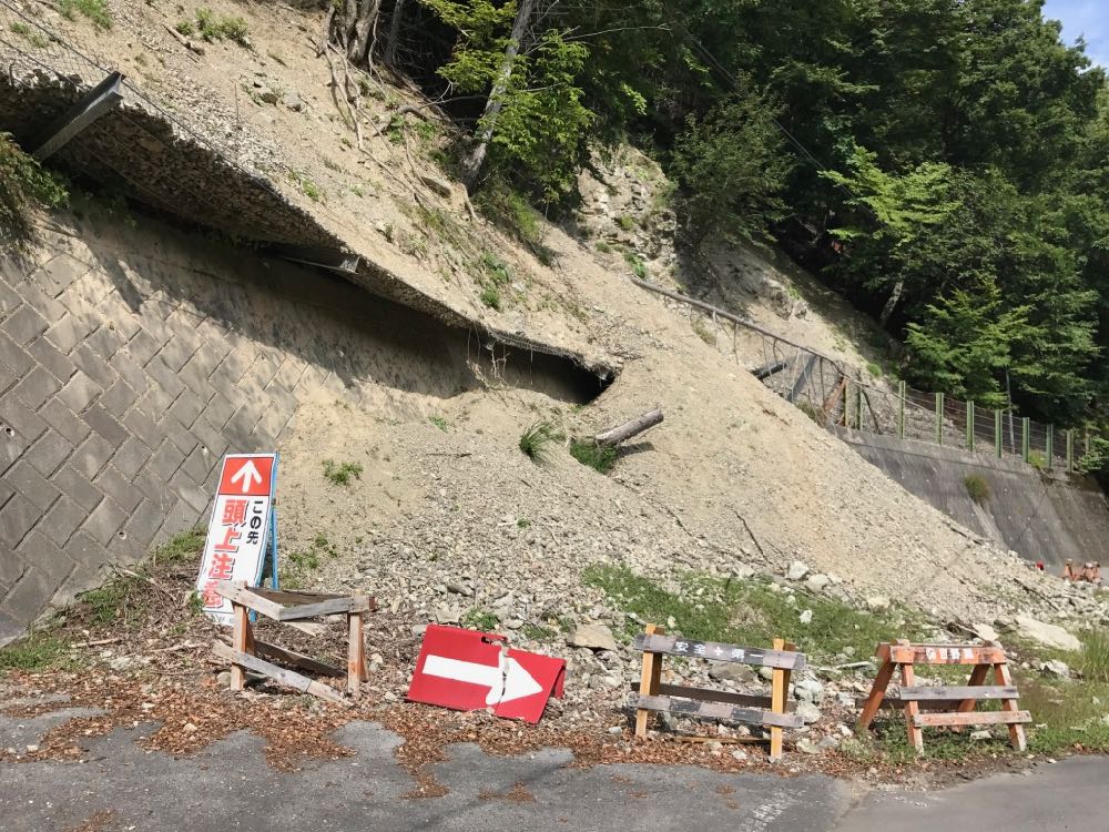 土砂崩れの生々しい跡がそのままになっている箇所も。