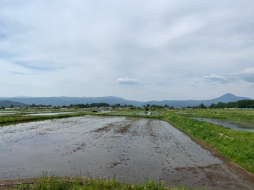 田植えシーズンのようで、ちいさな苗が等間隔に並んだ田んぼと