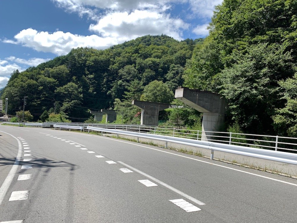 地蔵峠を下りきったら三遠南信道の作りかけの橋脚を右手に、さらに南下。