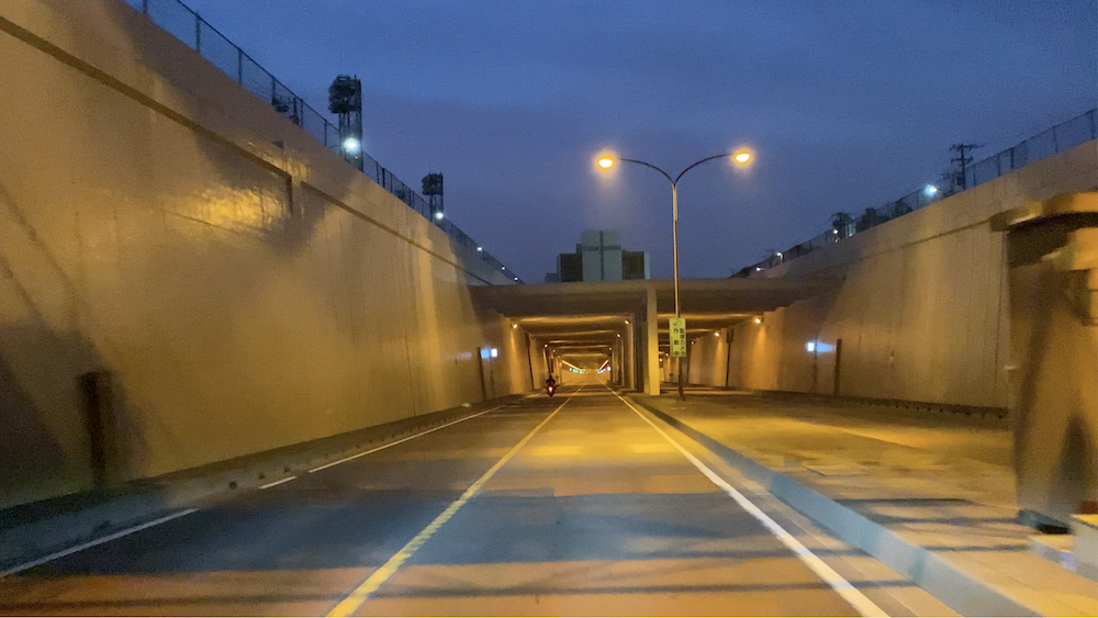 ゆるやかにカーブした沈埋トンネルと、
