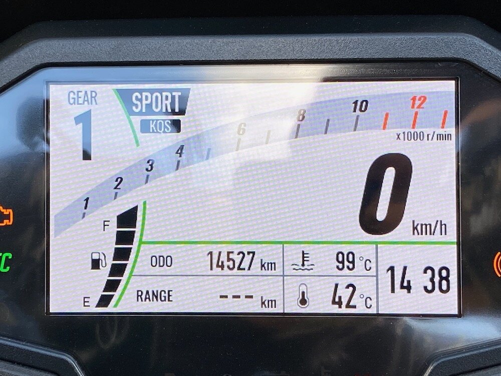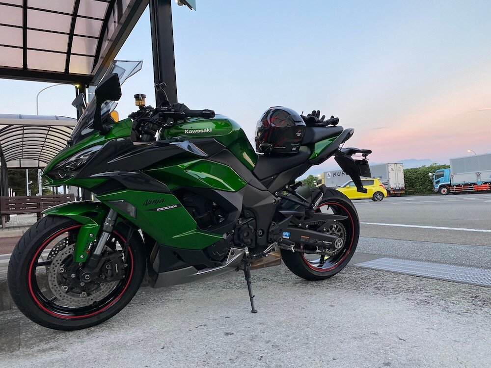 ハンドルの高いNinja1000SXで必死に伏せてスクリーンに身を隠します。