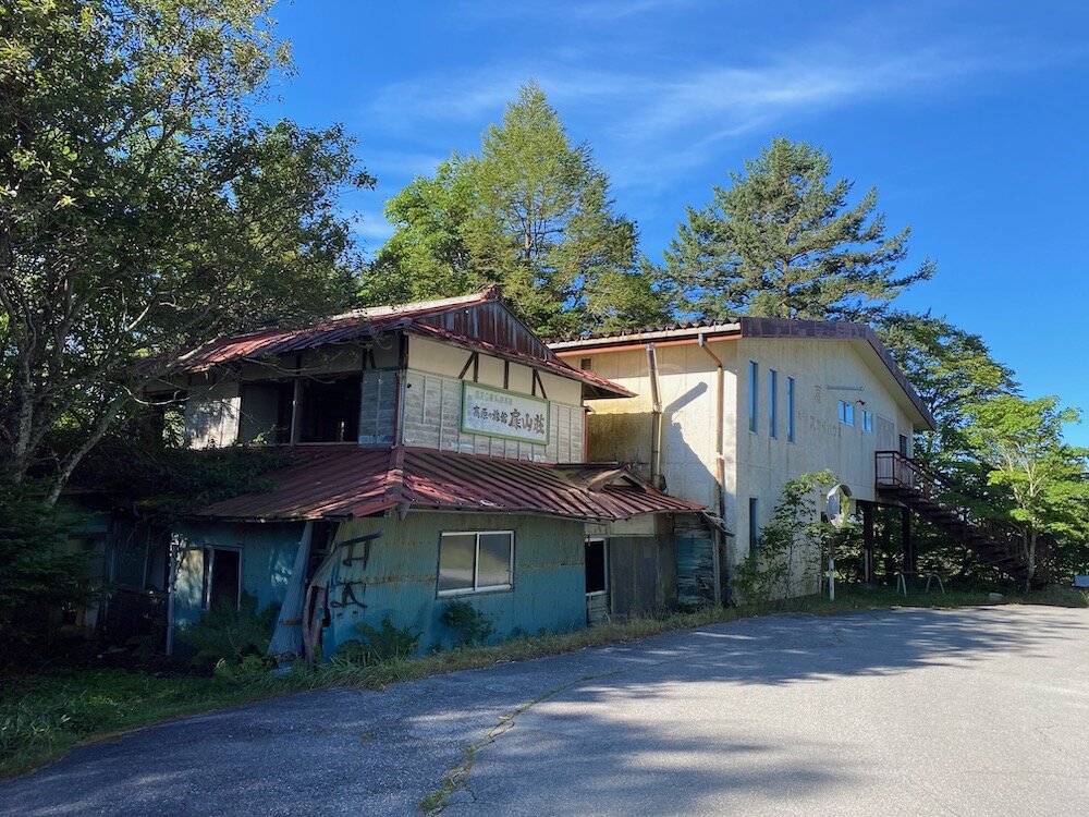 扉峠の脇には、バス停の先には廃墟となった扉山荘がたたずみます。