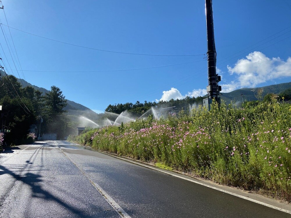 途中、盛大に水撒きしている畑だか庭だかがあって、朝日にしぶきが反射して綺麗でした。