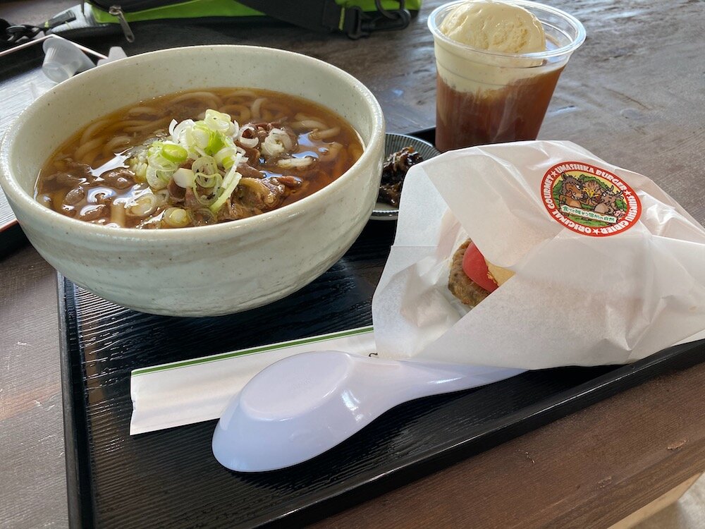 メニューは馬肉うどんと馬鹿バーガーをチョイス。