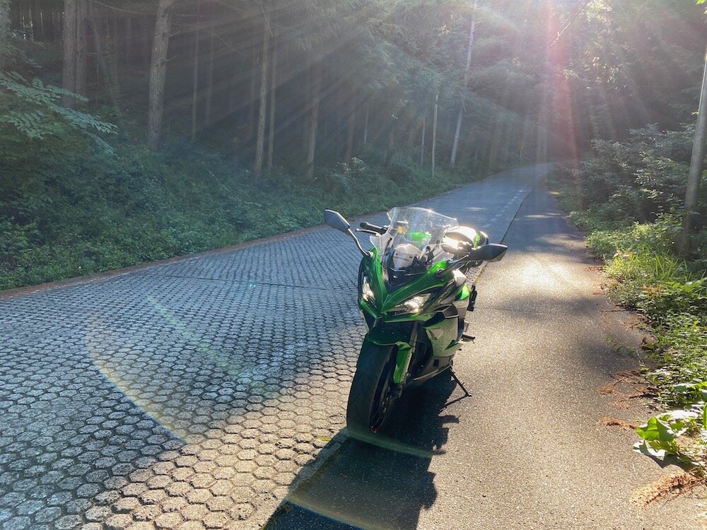 まだこの時間でも、チラチラと差し込む木漏れ日が眩しくて路面がみえづらいので、ゆったり安全速度で降っていきます。