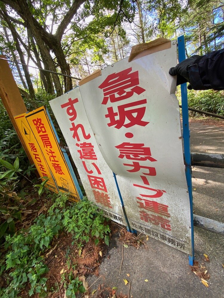 べろんとめくれてしまっている看板には「急坂・急カーブ連続」と書いてありました。