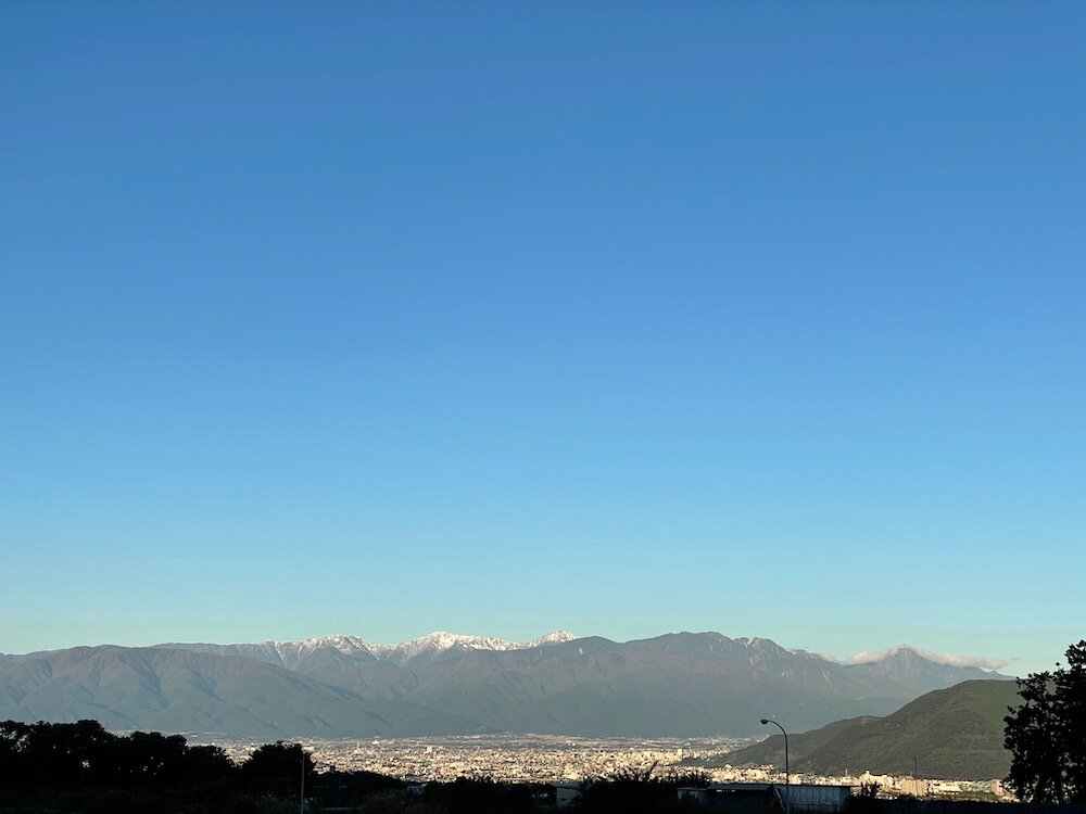 釈迦堂PAから望む南アルプスの山々は冠雪がはじまり、神々しい姿。