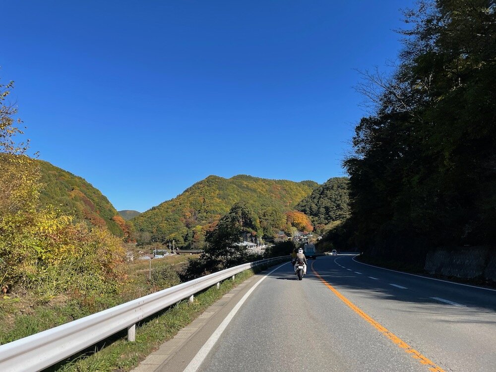 楽しいワインディングロードですが、下りはイエローラインの一車線、残念ながらトラックとなかよし走行。