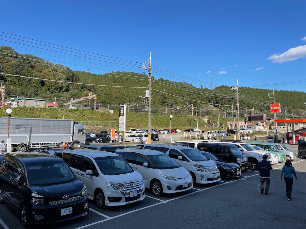 オープンカーの隊列に挟まれつつ碓氷峠を下り始めて中腹あたり、ちょうど正午を回ったころに熊ノ平駐車場に到着です。