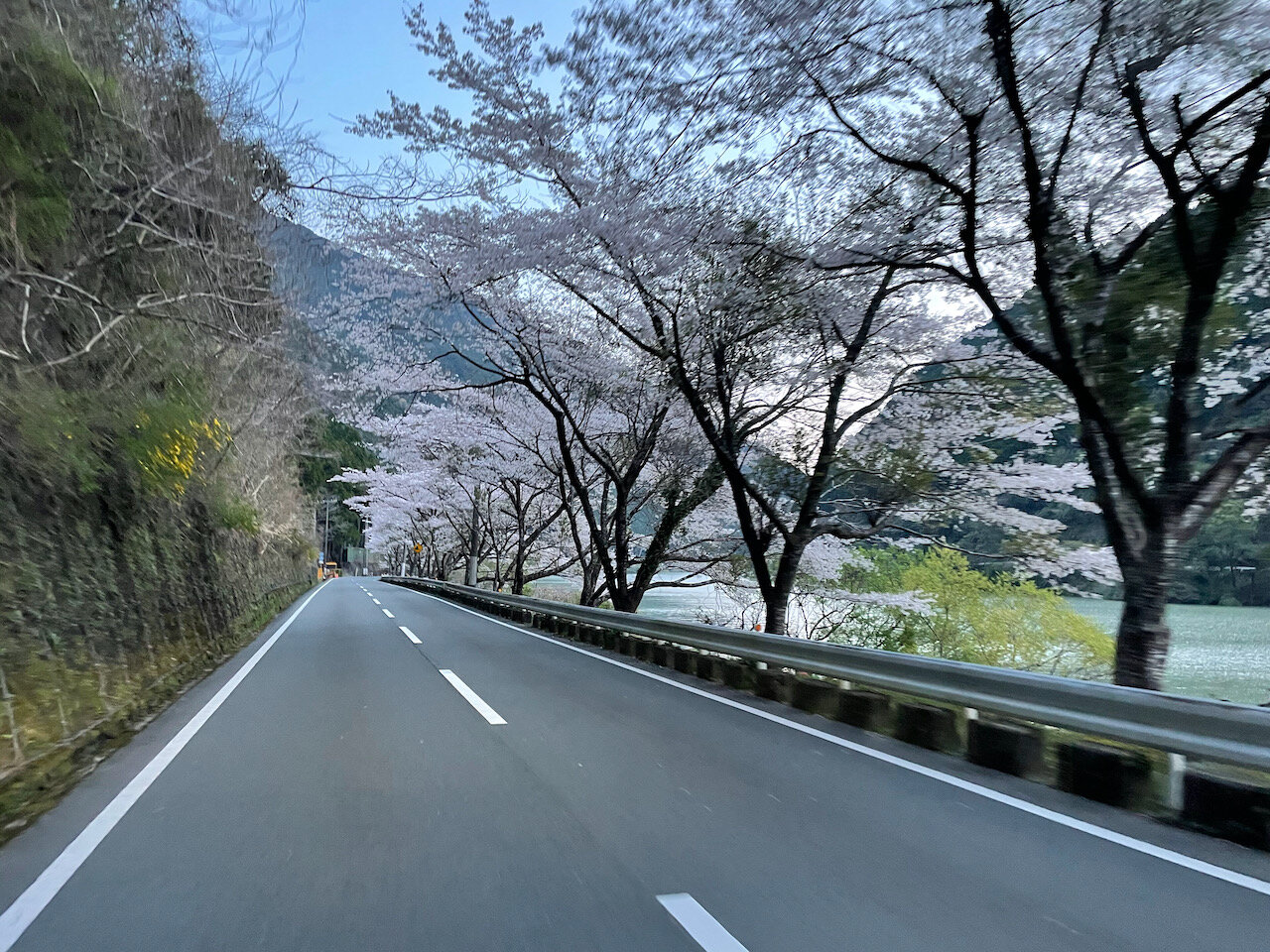 秋葉湖のほとりは桜並木になっている場所が多くて、明るくなり始めたら一気に風景に彩りが増します。