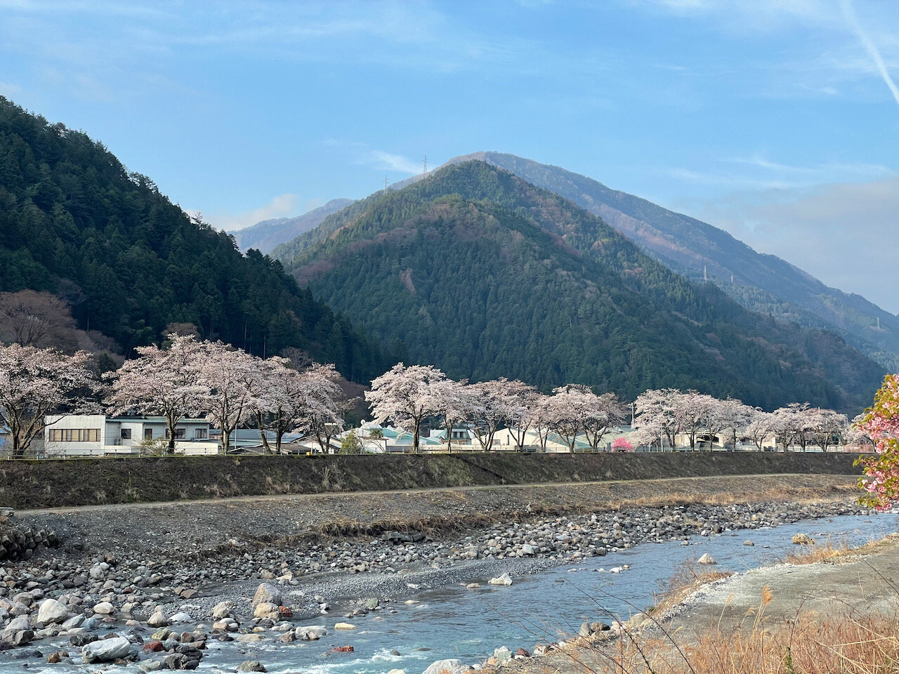 水窪に負けず劣らず、道の駅の裏にある遠山川の土手にも桜並木が咲き誇っていました。