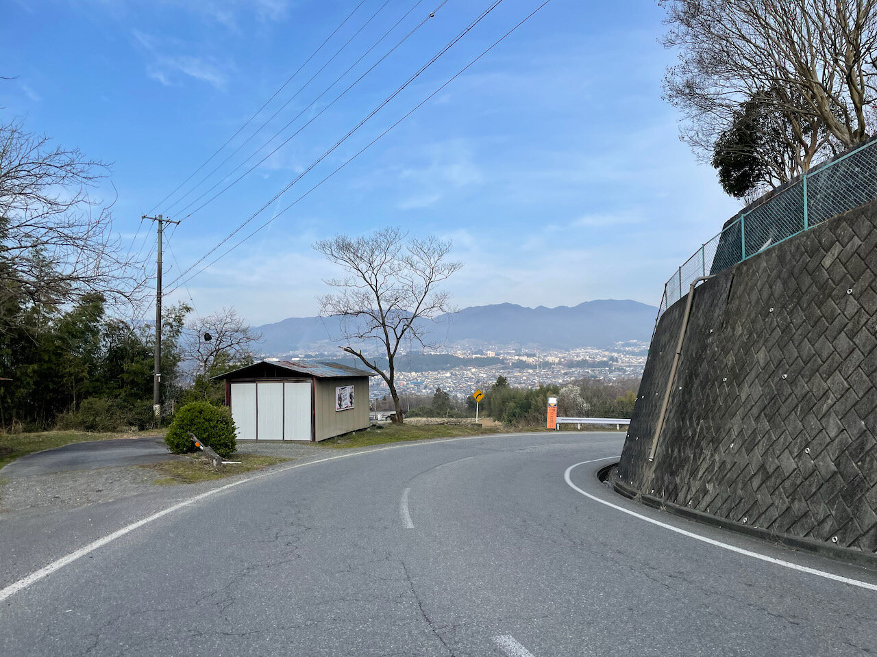 カーブ注意の看板脇に見えている高いアンテナがNHKの飯田中継所ですね。