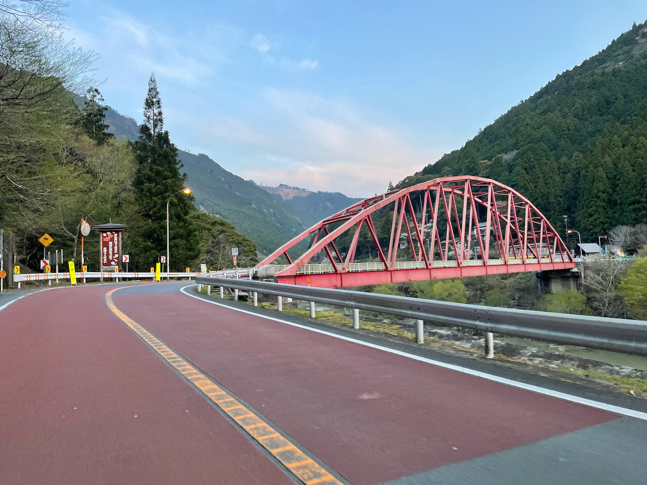 赤いアーチの大輪橋を渡ったら、道は左岸へ。