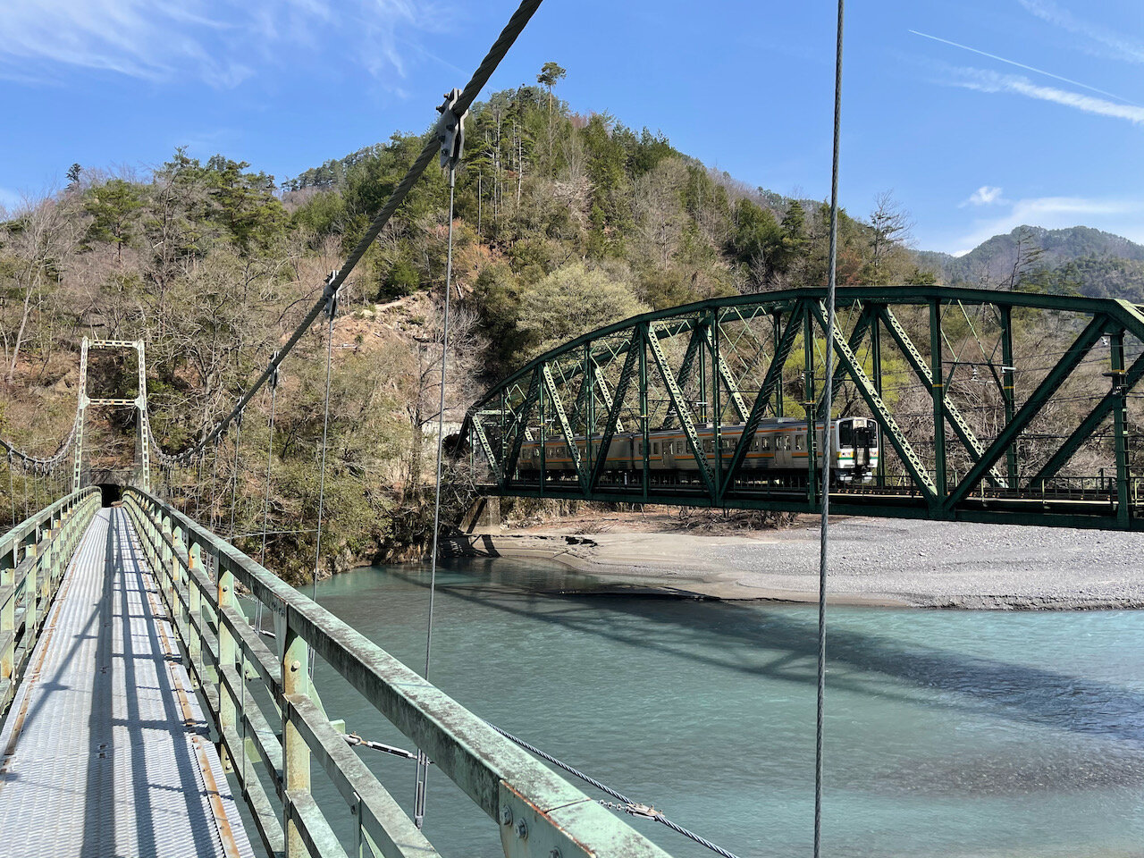 この吊り橋は元々の飯田線の旧線があった場所に架かっているので、先程の旧十方峡トンネルを出た先、ちょうど正面に位置します。