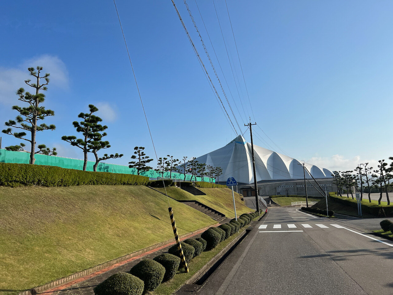 大きな屋内テニスコートの屋根と、実に16面も確保された広大な屋外テニスコートがあります。