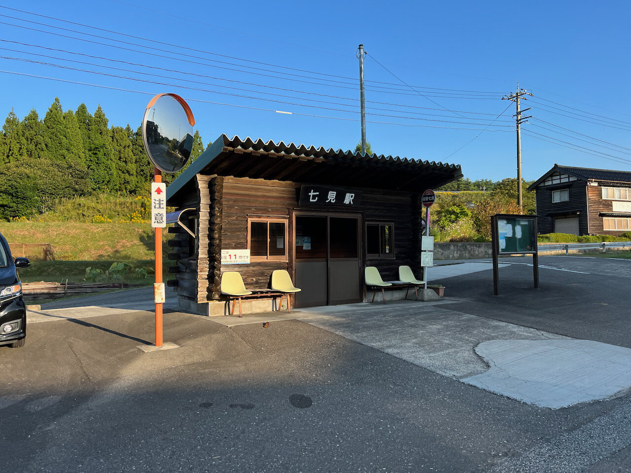 道沿いにある七見駅跡は駅舎だけが残され、バス停留場として活用されていました。