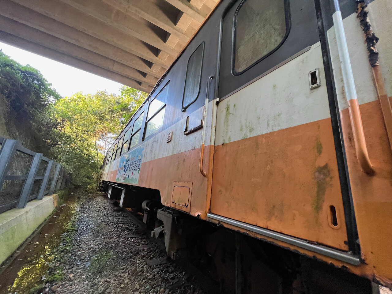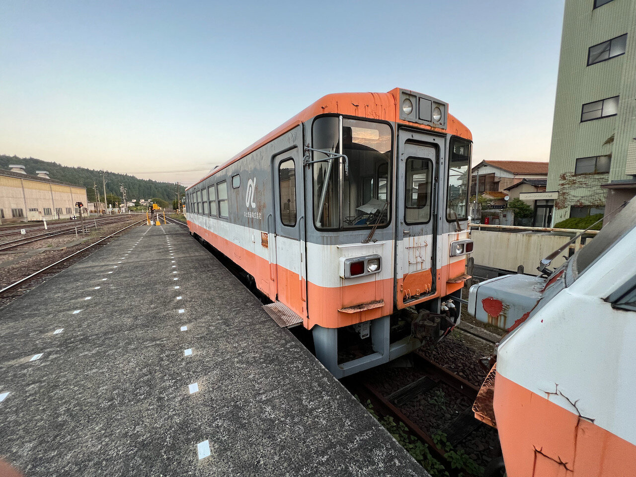 オレンジをベースとした旧色をまとうこの車両は、見てわかる通り廃車体です。