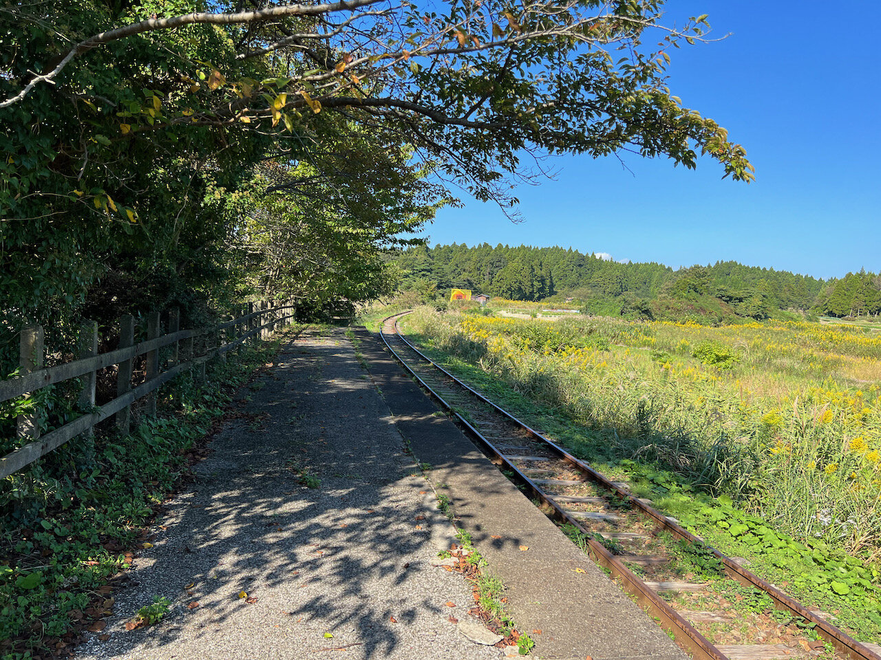 沿道にある不自然な草地は廃線跡。