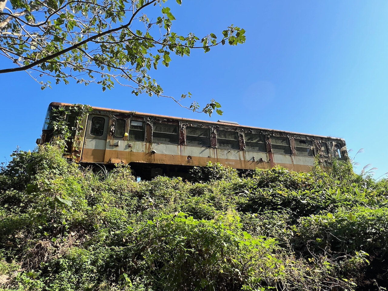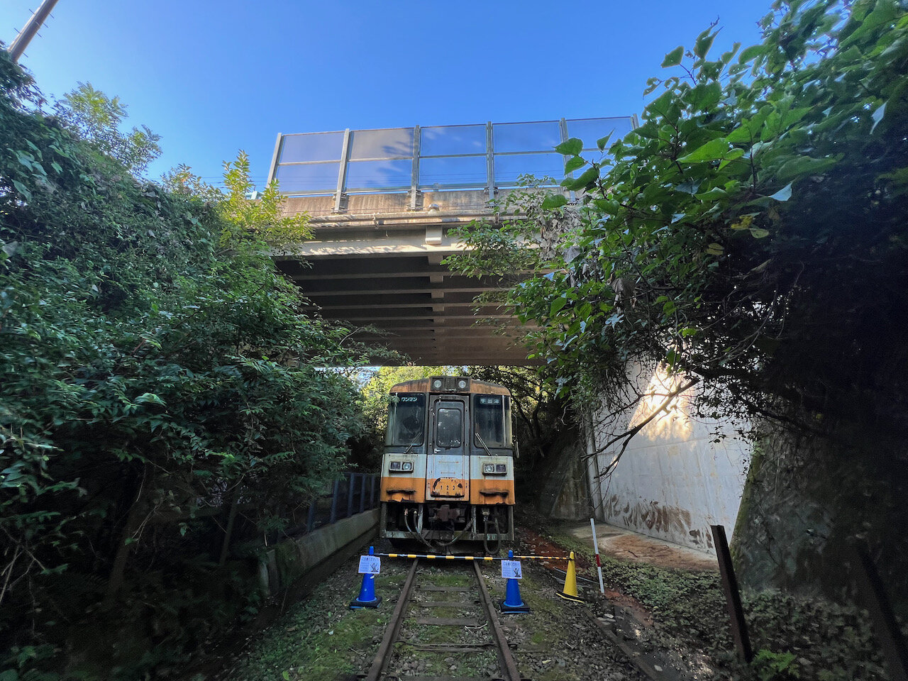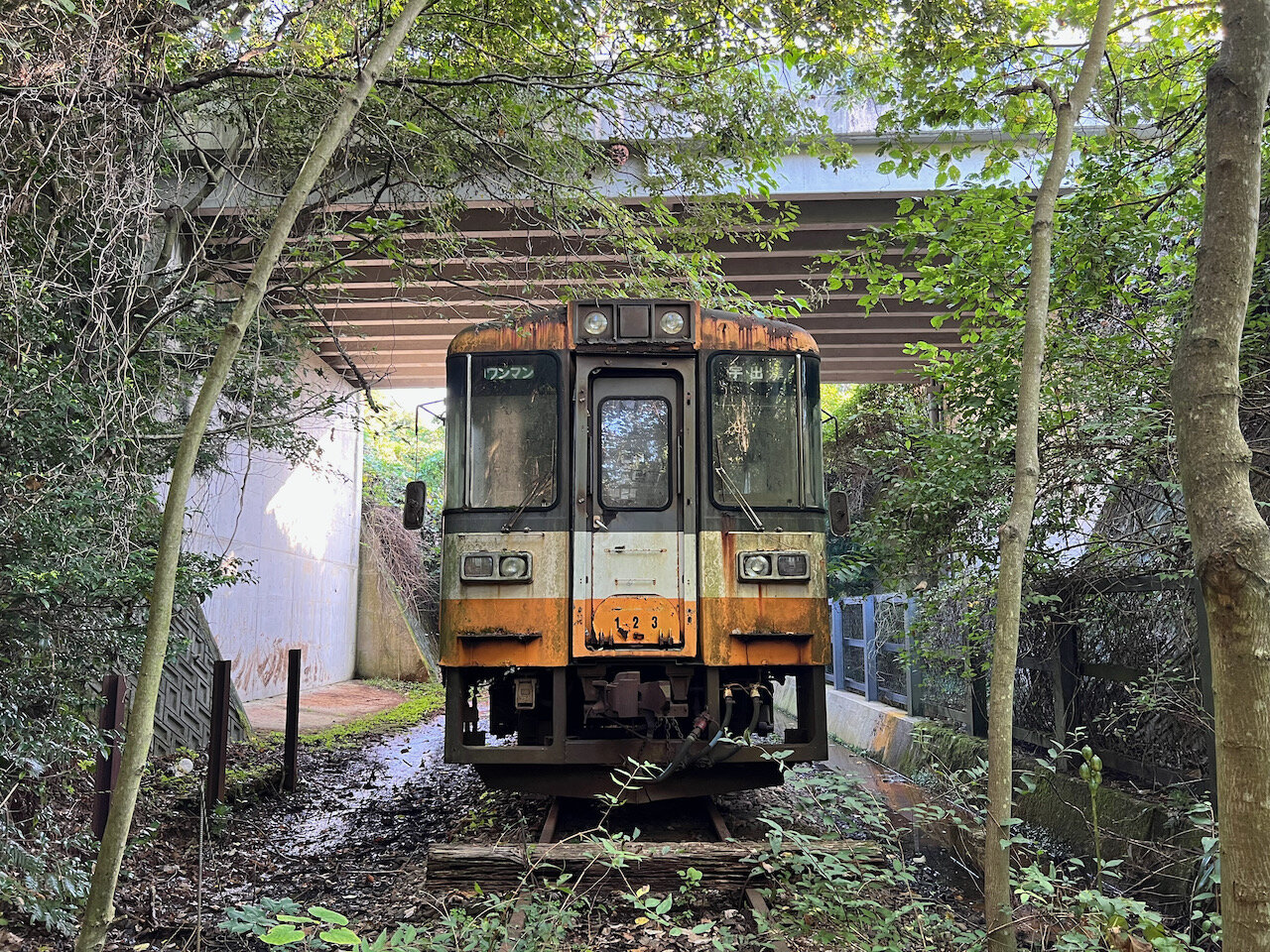 どこともつながっていないレールの上、綺麗に整備されたスポーツ施設の合間の谷底に佇む廃車体。
