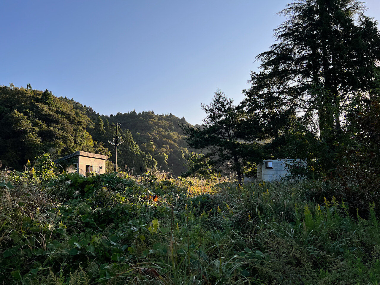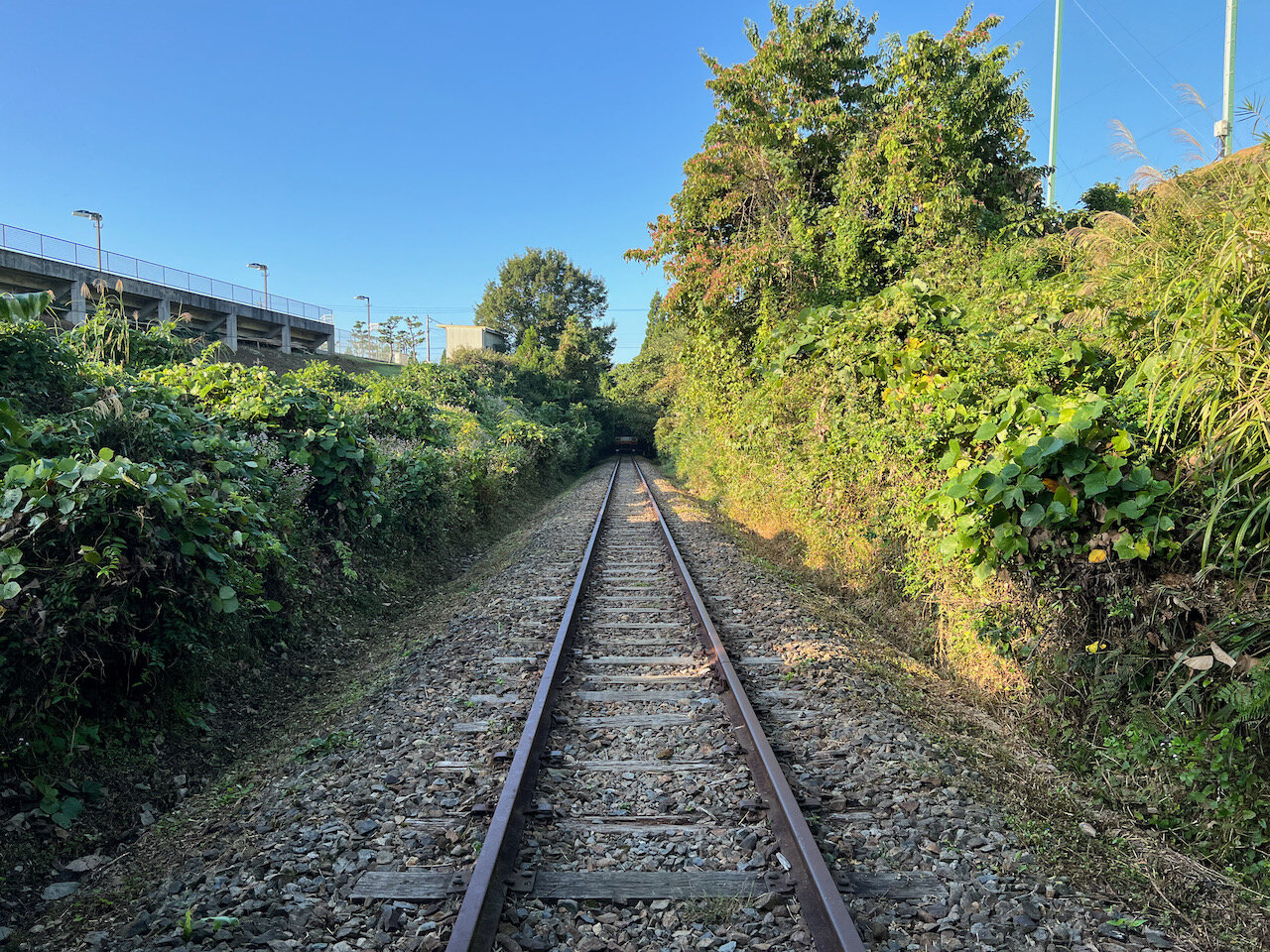 草刈りされている道路側の路盤跡と対照的に、山側の路盤跡は完全に緑の海になっていました。