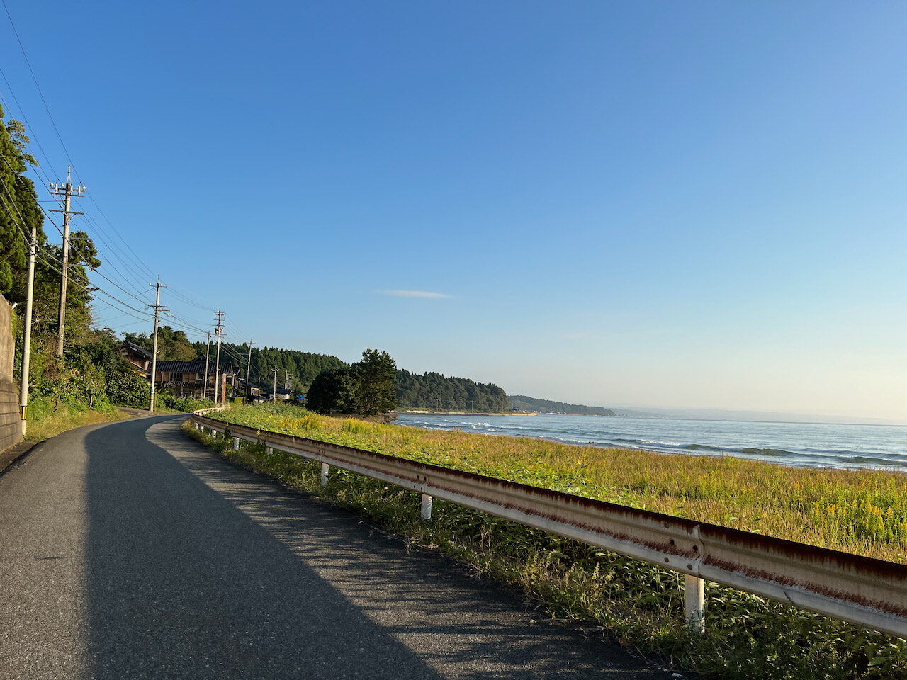 朝日に照らされた前波の港町を抜けます。