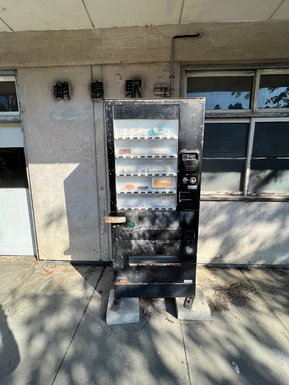 駅前の自販機も当時のまま放置かと思いきや、なんとタバコ自販機を利用したお土産販売機で、現役でした。