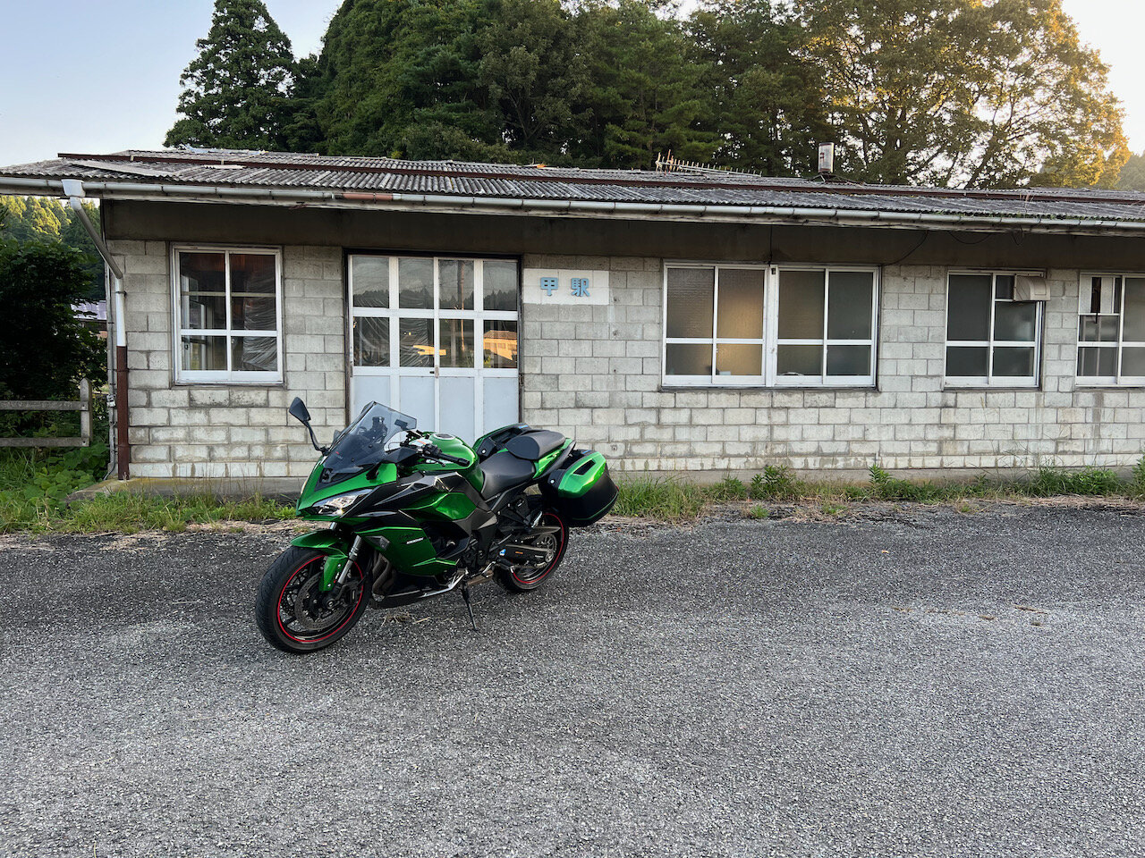 かつてあった比良駅、鹿波駅をスキップし、6:30を回るころ、コンクリートブロック作りの大きな駅舎が残る甲駅跡に来ました。
