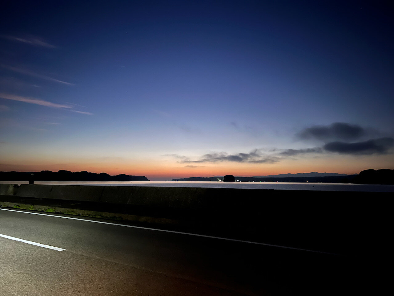 能登島の南岸をゆったり走っている間にどんどんと太陽が地平線に近づき、東の空は曙です。