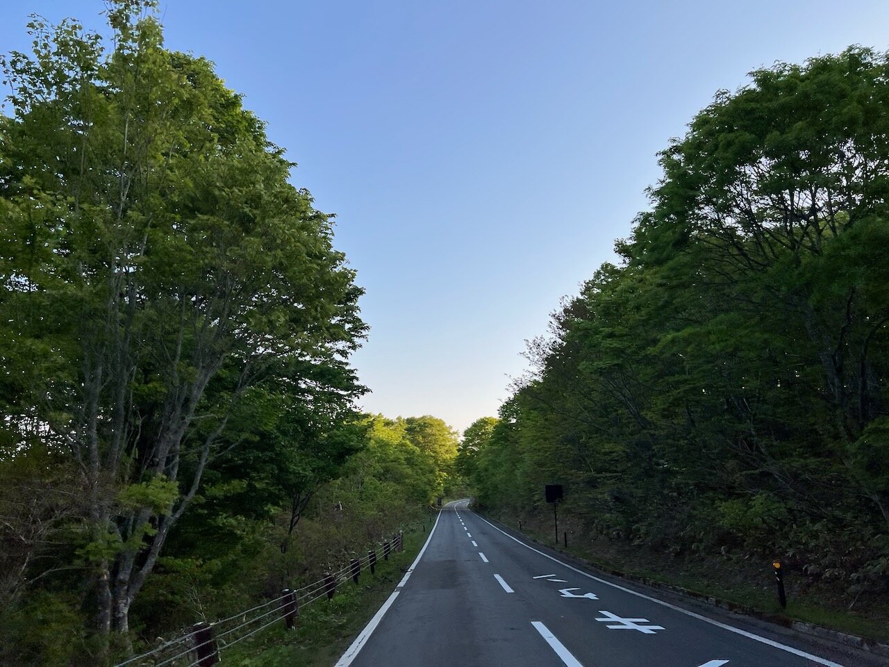まだ地平は暗く、空だけが明るい夜明け直後の道をスイスイ走っていきます。