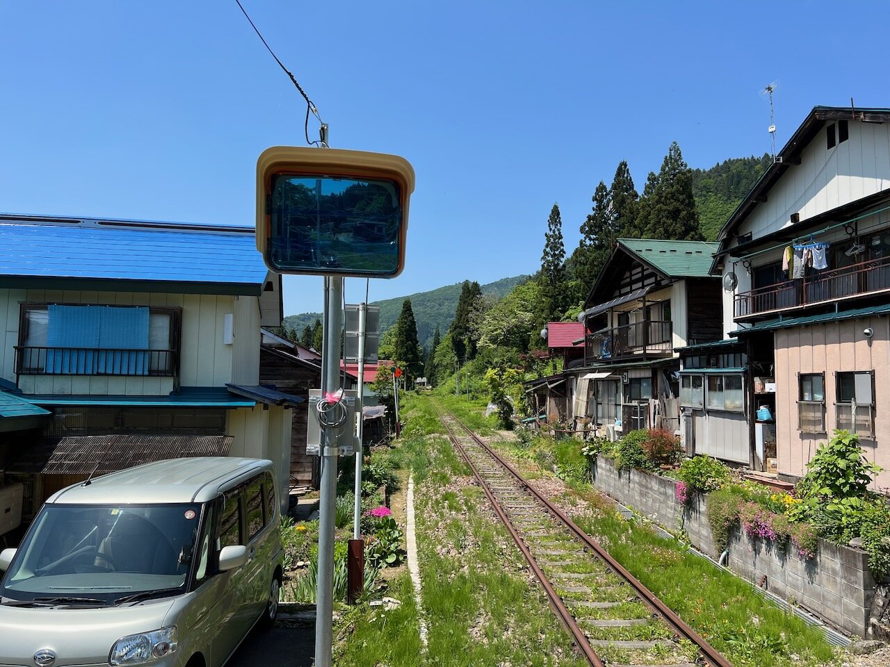 遮断機のない踏切なので締め出されることはないのですが、それはそれで列車接近時に怖いw