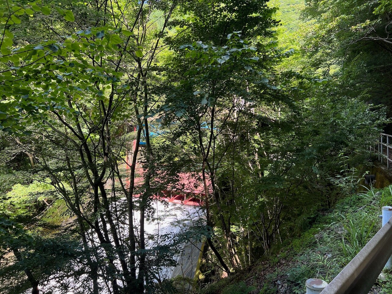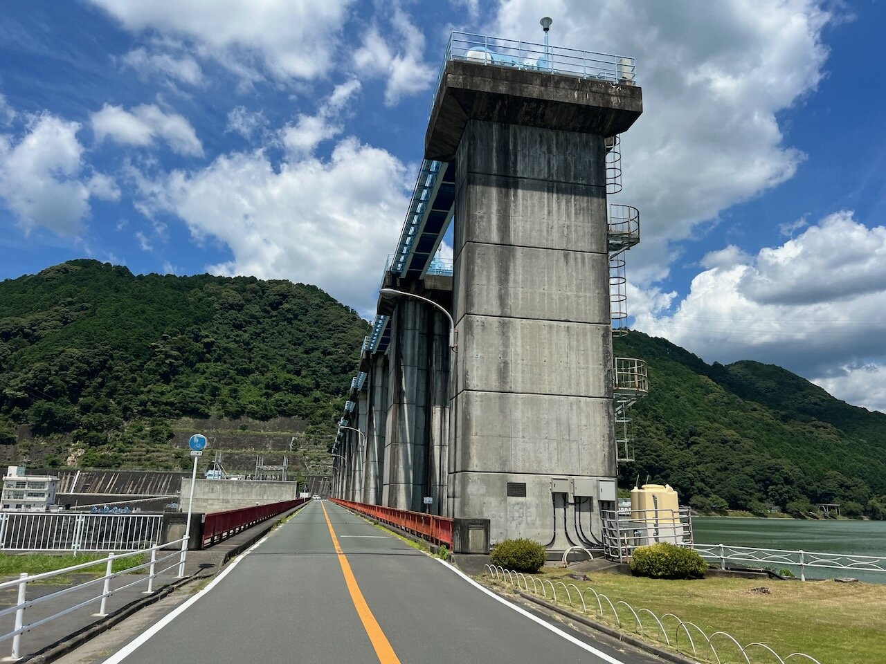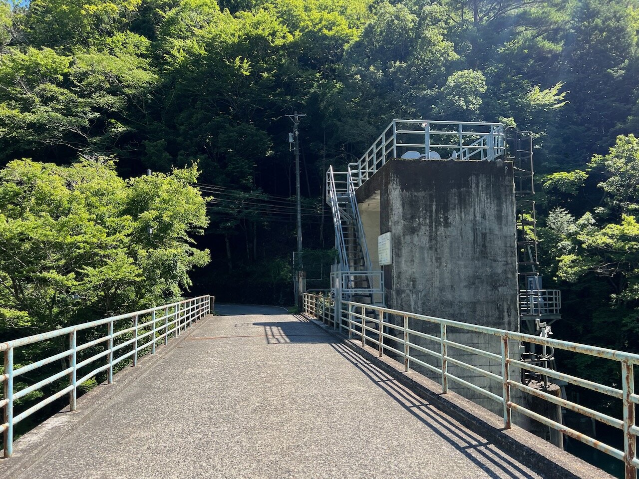 豪快な水音を立てる豊岡ダムの堤体が木立の隙間からチラッと見えました。