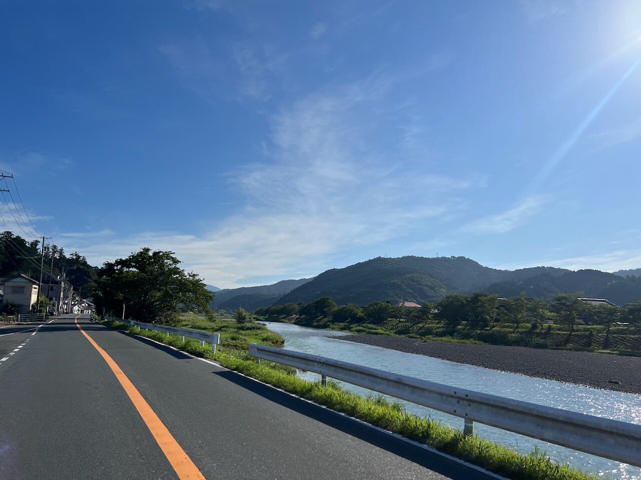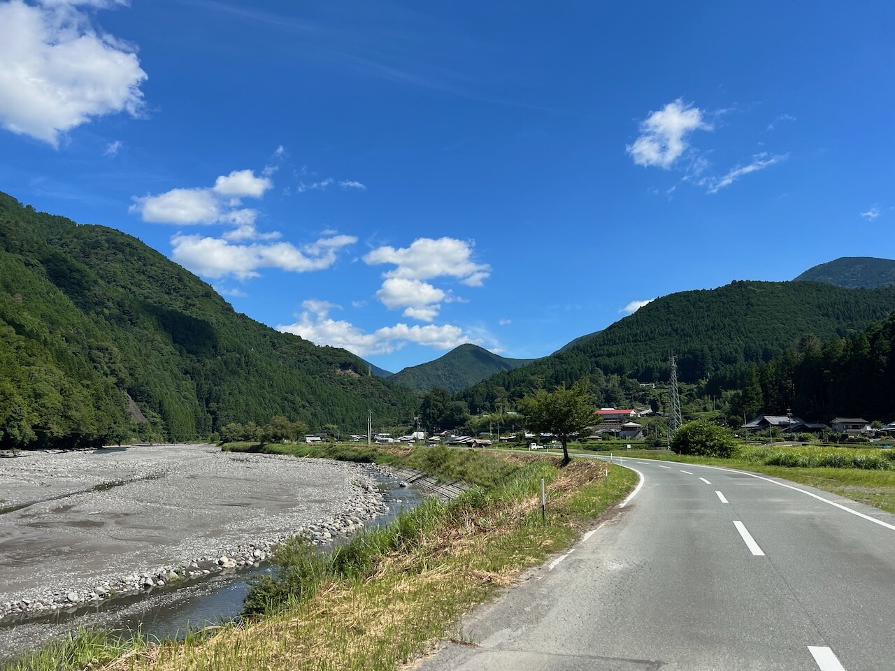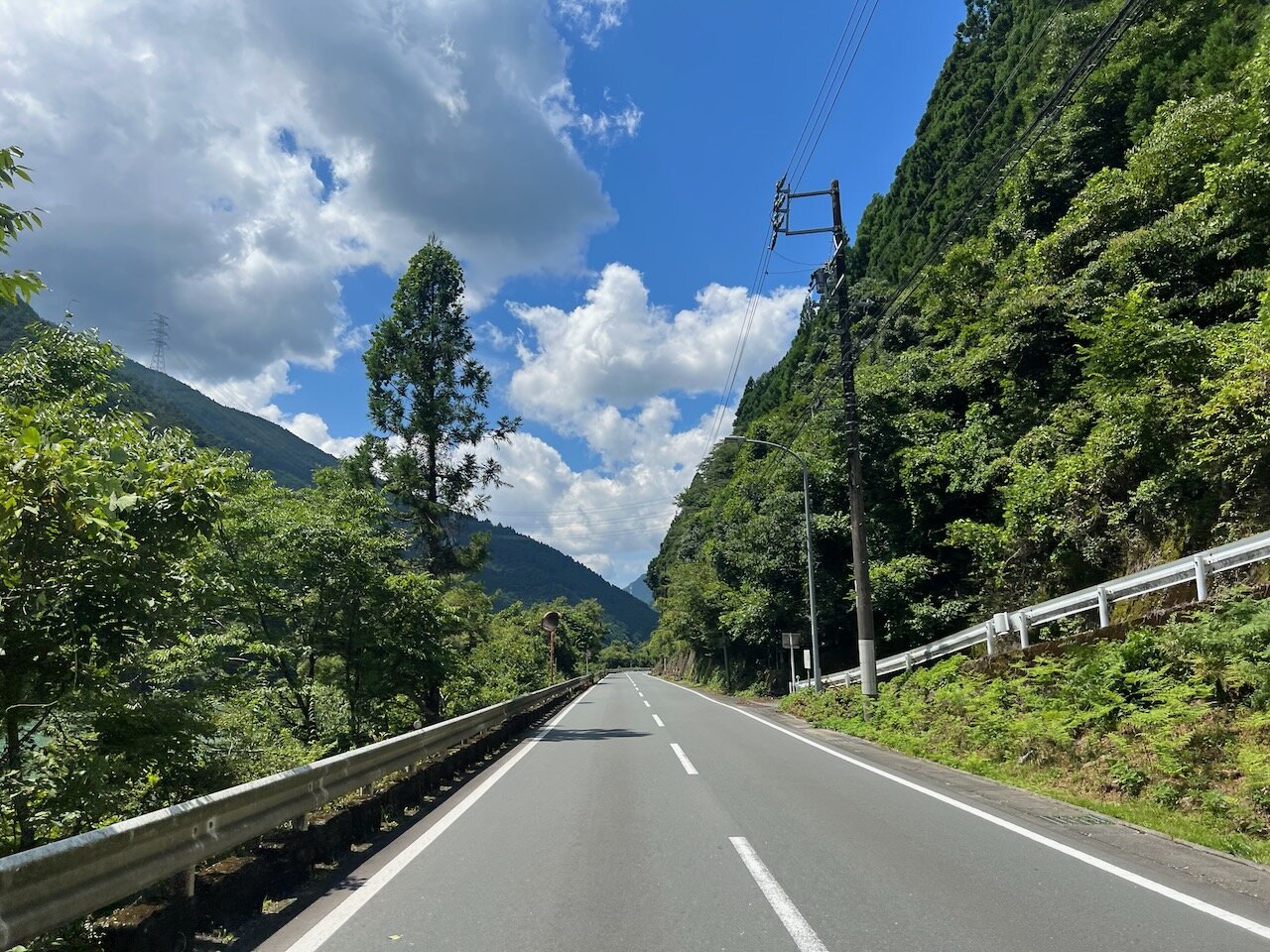真っ青に染まった空、深い緑の折り重なる山、すばらしい風景の中を快走。