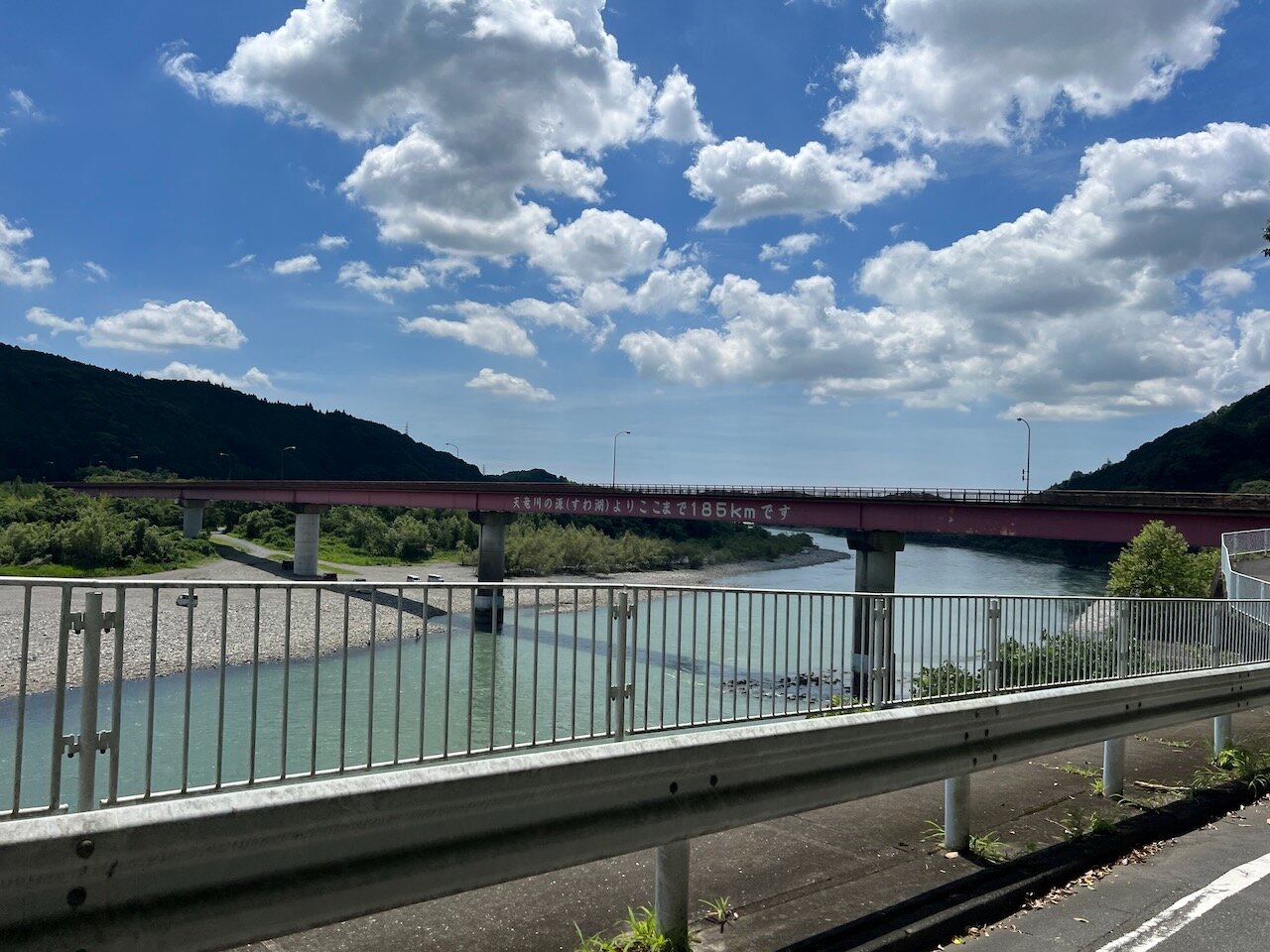 諏訪湖から185kmの文字が誇らしげな(だけど諏訪って漢字で書けていない)塩見渡橋を横目に見ると、本日最大にして最後の目的地。