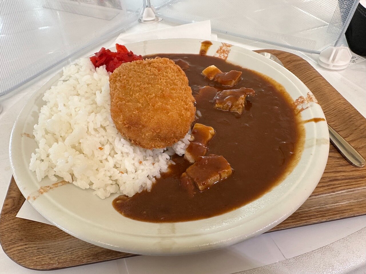 ポークのブロック肉がゴロゴロしていて肉度数は結構高いですが、メンチカツを別で買って乗せてさらにボリュームアップ。