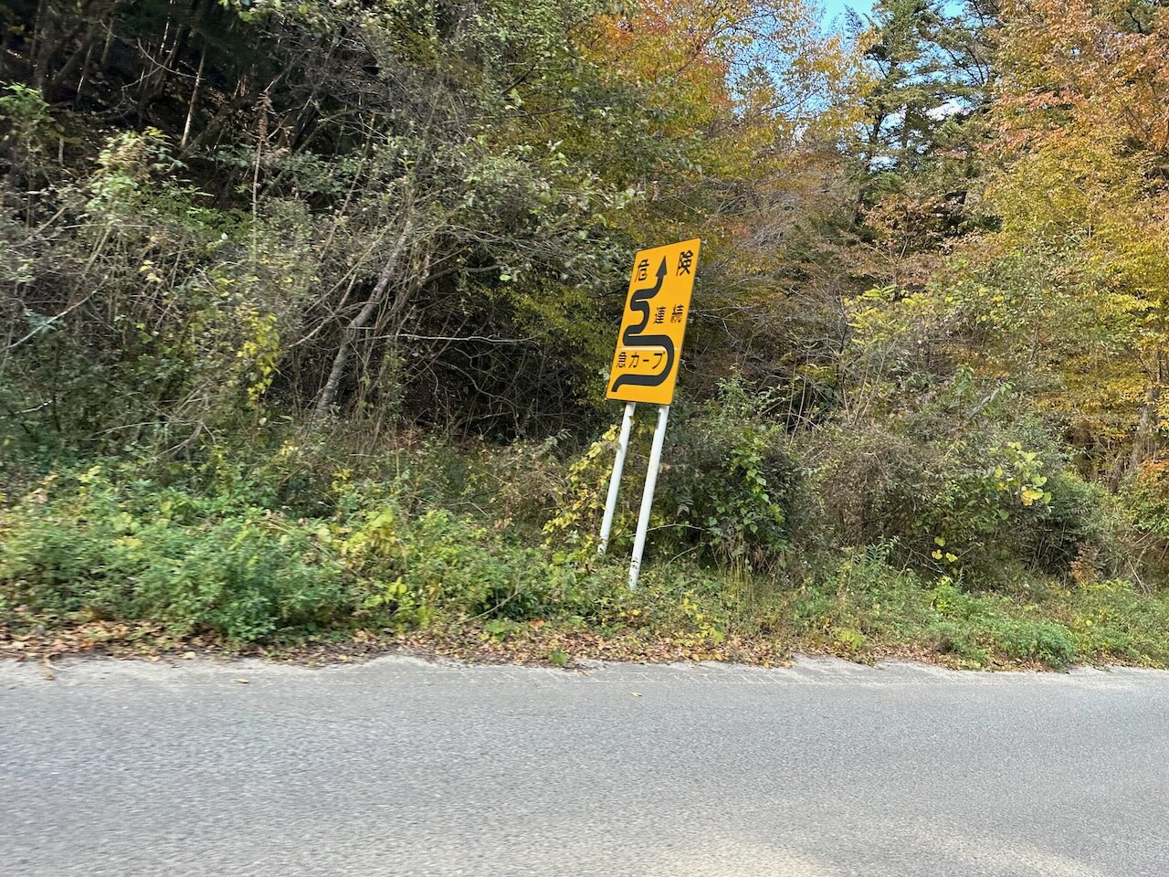 道はぐねぐねしてるぞーと言わんばかりの看板。