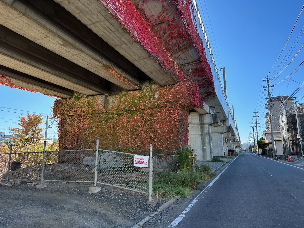 新幹線の高架下は蔦が真っ赤に紅葉してアーケードのようになっていました。