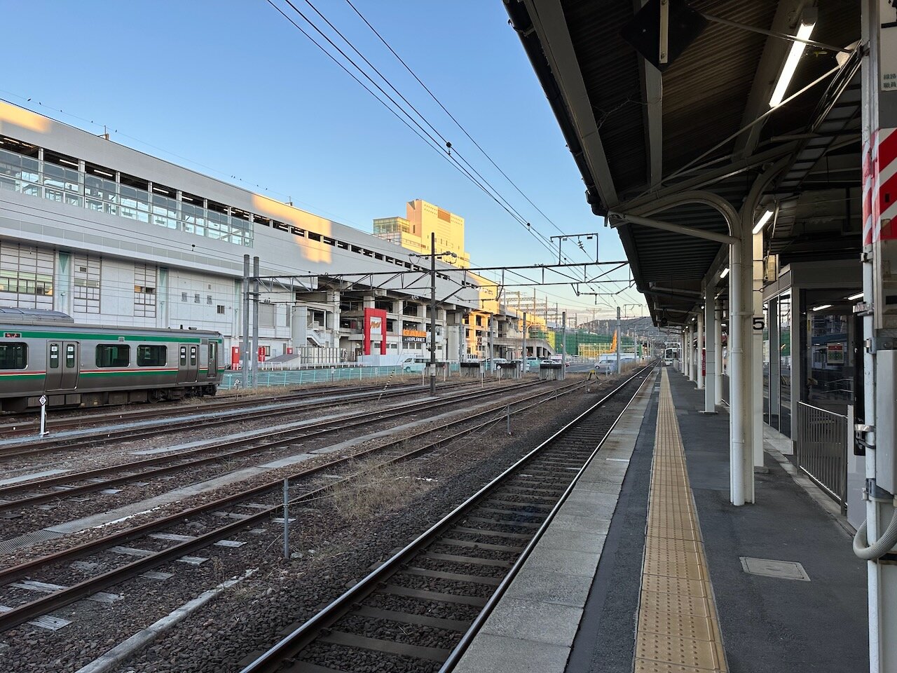 ホームに接続する奥羽本線の線路と、奥の東北本線の留置線で線路幅が違うのがよくわかります。