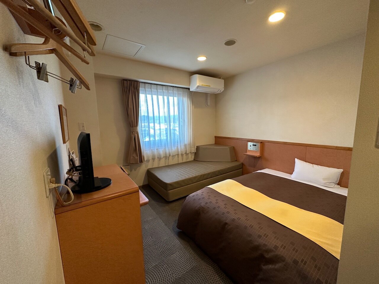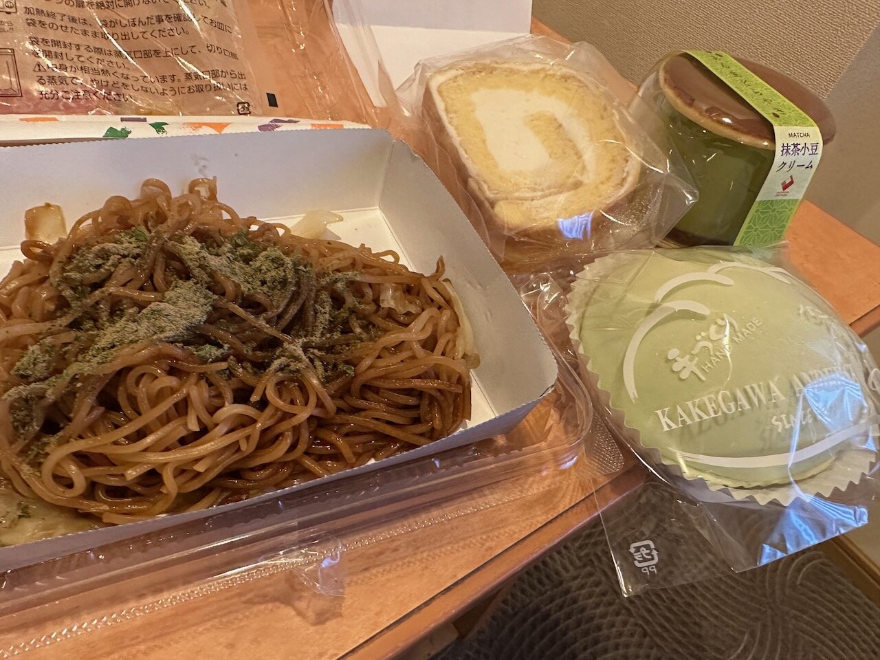 夕食は門出駅で買ったスイーツ類と、ホテルにあった冷凍の富士宮やきそば。