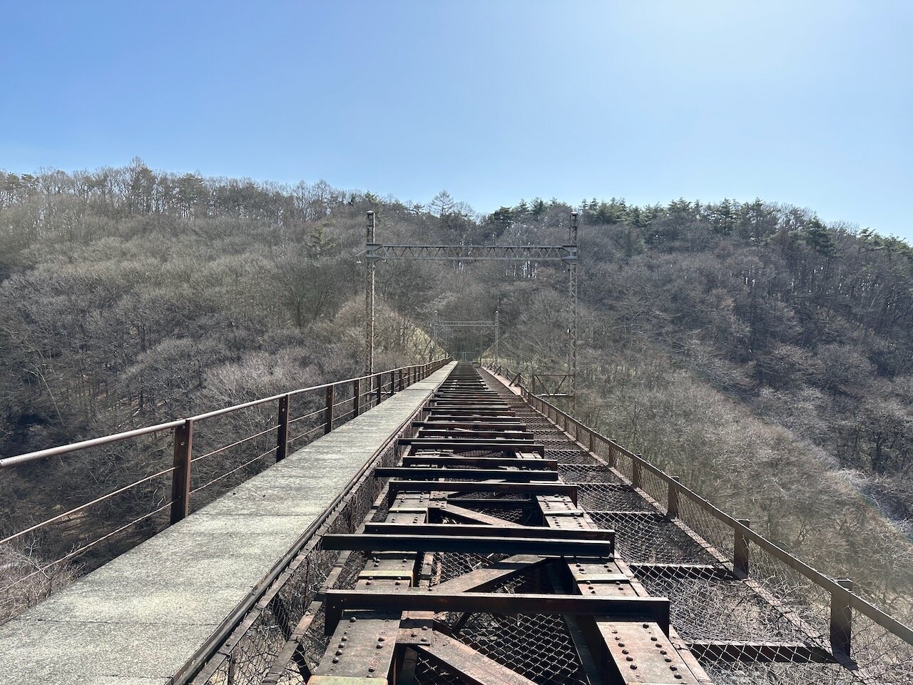 この橋は1980年まで現役で使われていた単線の線路で、中央本線が複線化するのに伴ってルート変更が行われたタイミングで廃橋となりました。
