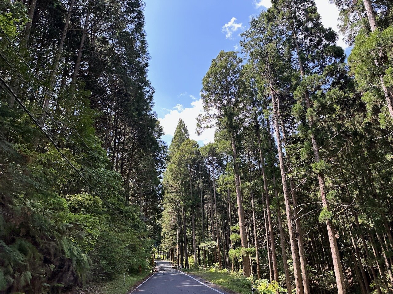 ダム湖を過ぎると県道と合流し、杉林の中を抜ける道になります。