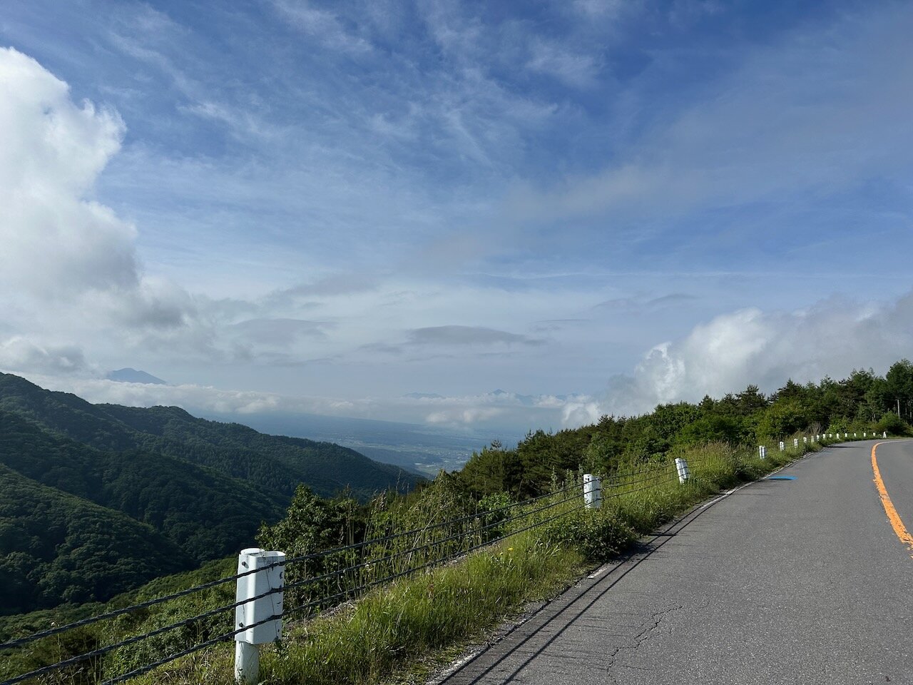視界は完全に青と緑に支配され、唯一の暖色はセンターラインの黄色だけ。