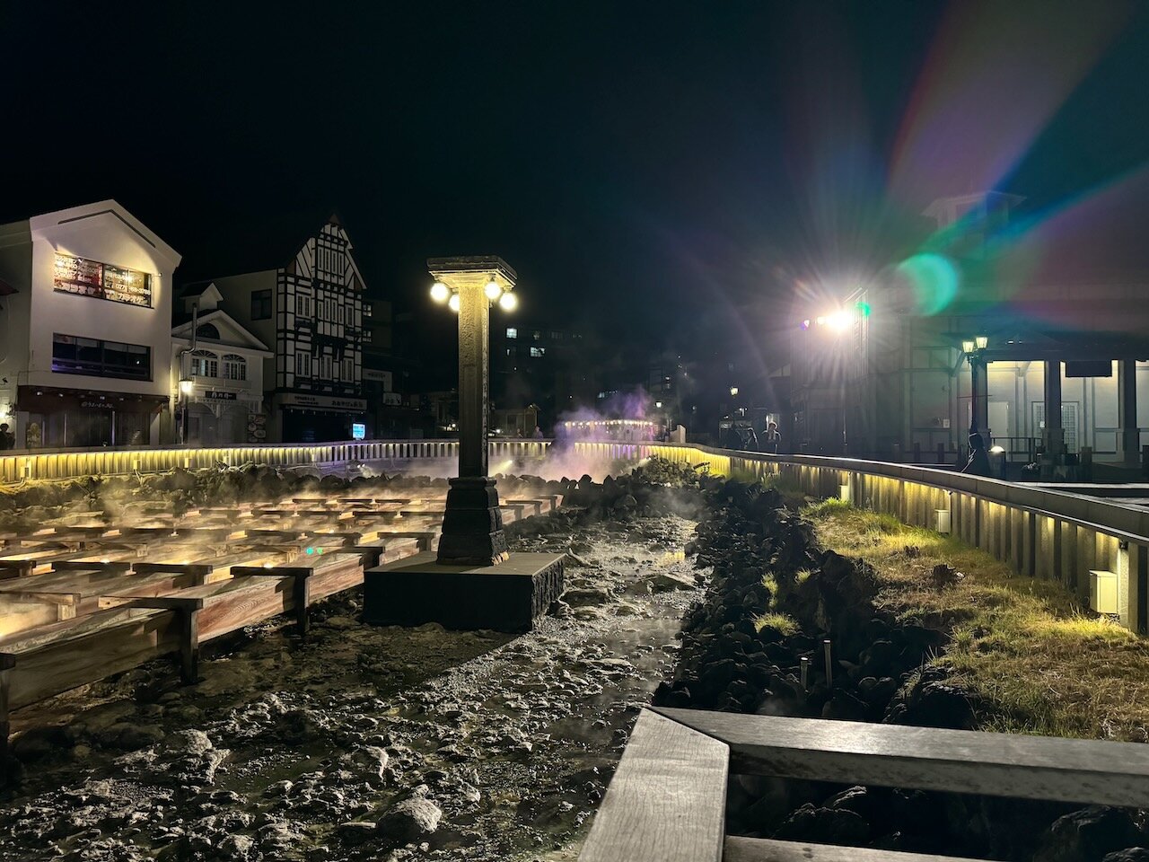 前回来た時は昼だったので知りませんでしたが、湯畑は25:00までライトアップされているんですね。