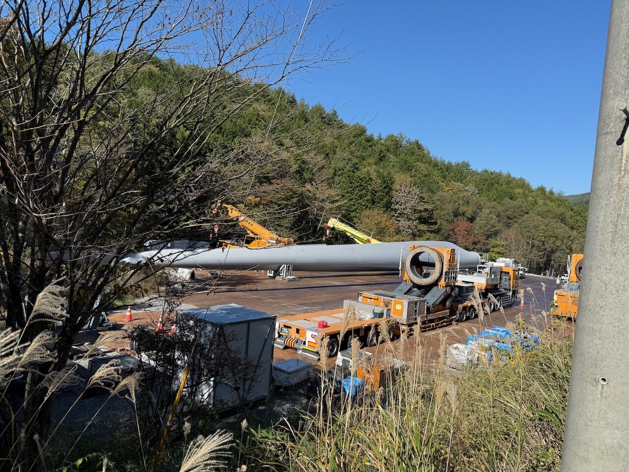 高原らしくいい風が吹くのか、風力発電施設の組み立て現場を沿道に発見。