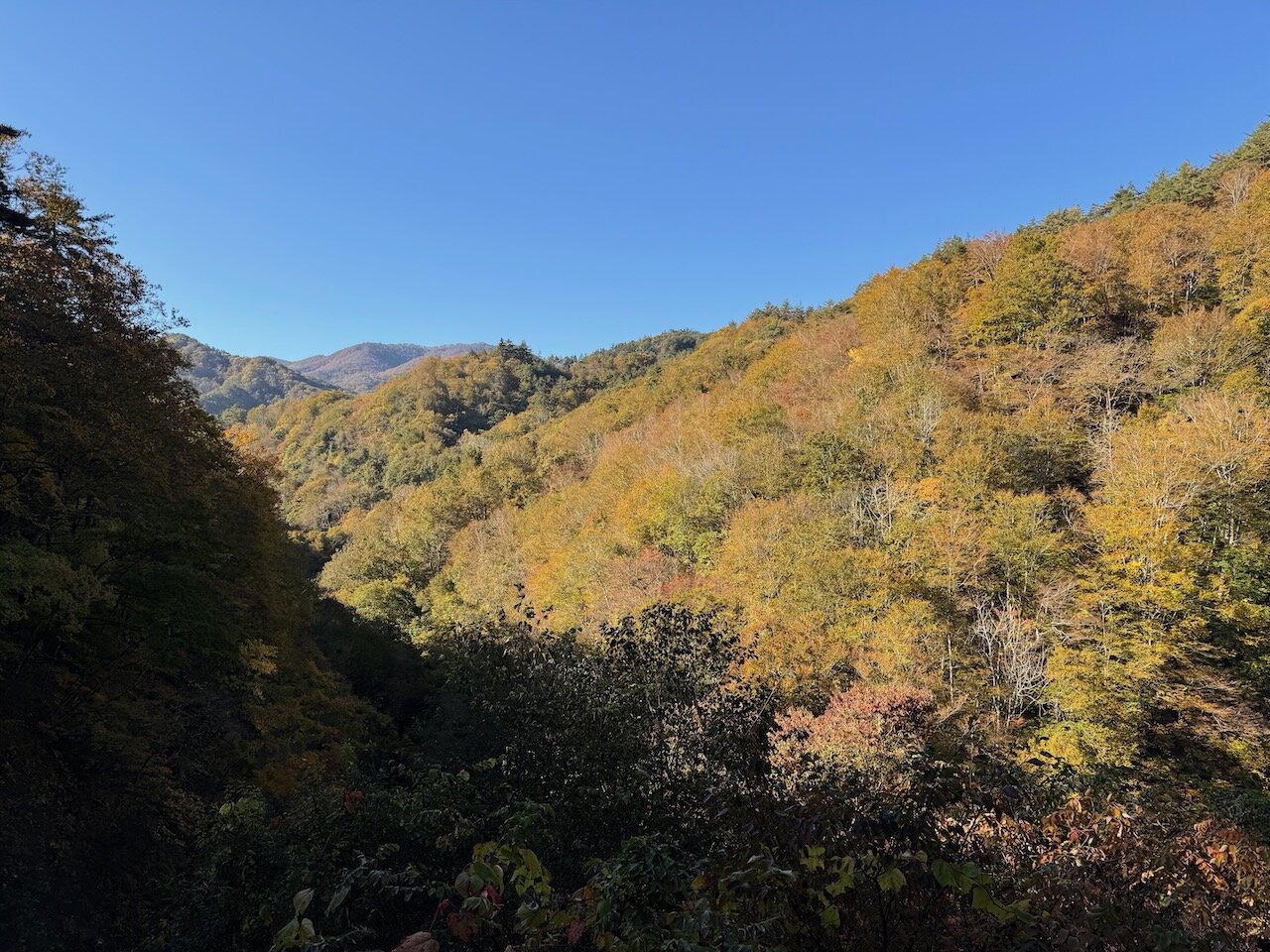 青い空に輝く紅葉の木々を見たかと思えば、やや下がって木々の背が高くなってくるにつれ、色づきはじめの黄緑色が空を覆います。