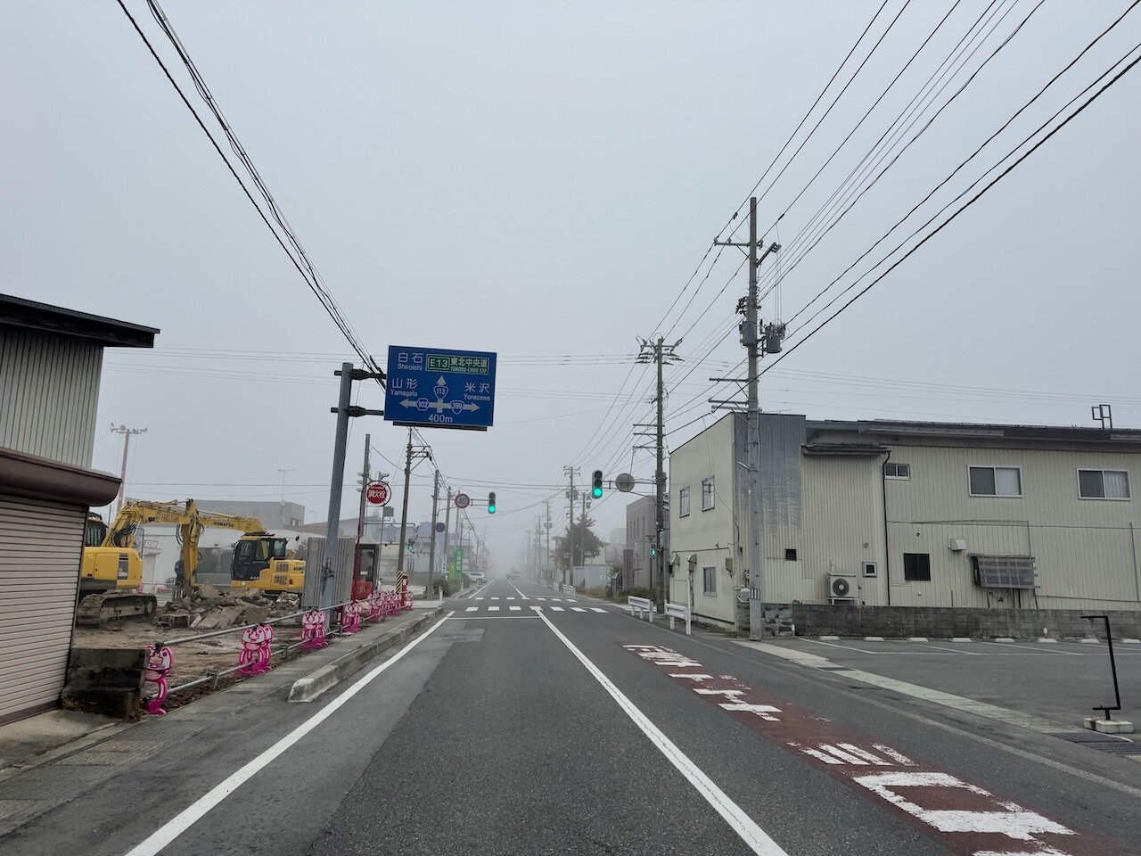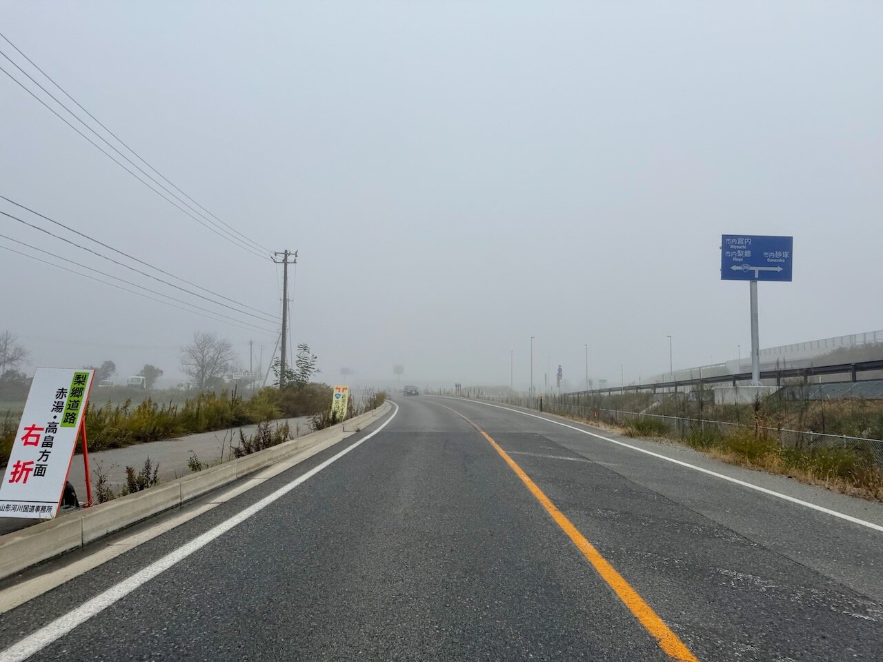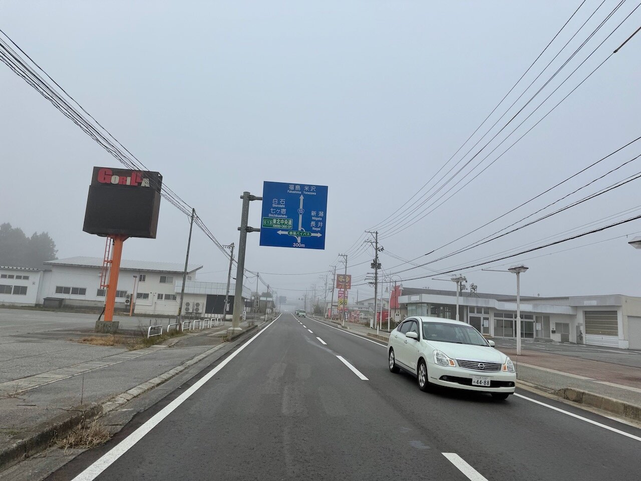 濃霧の中、米沢北ICで下道に降り立ち、給油して南陽へ。