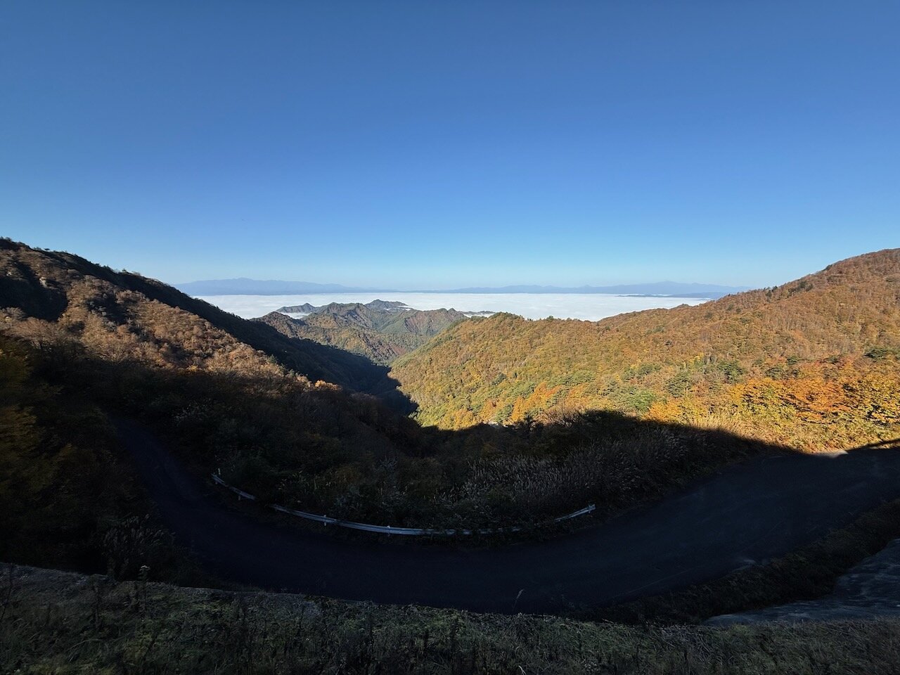 霧は米沢の盆地にだけ立ち込めていたようで、峠へのアプローチを開始した途端に視界がクリアになりました。